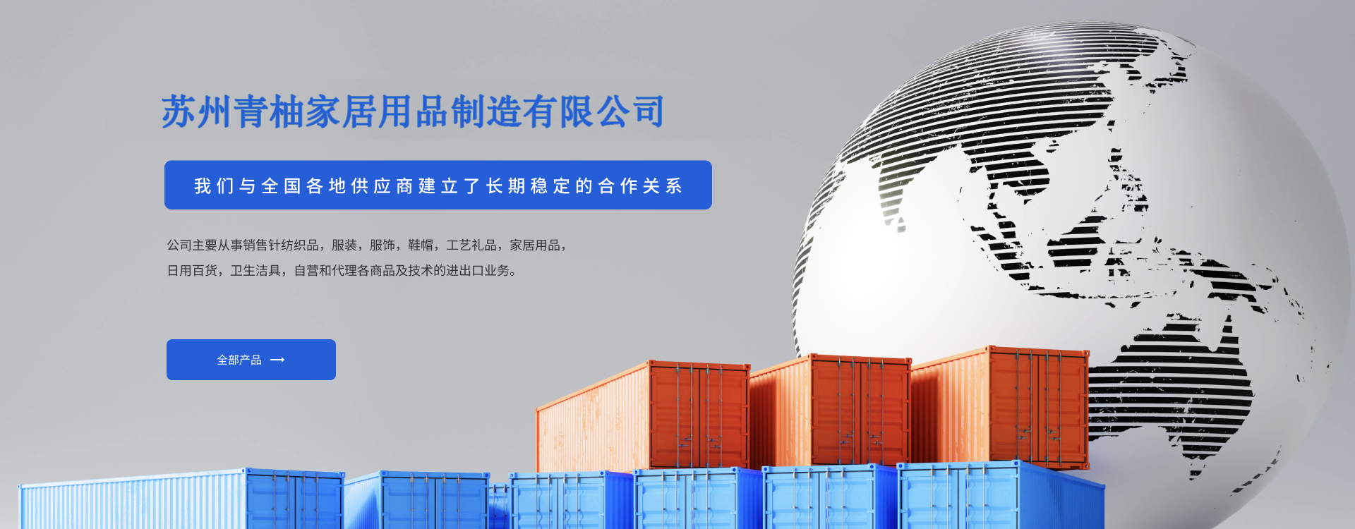 蘇州青柚家居用品制造有限公司,主要從事銷售針紡織品,服裝,服飾,鞋帽,工藝禮品,家居用品,日用百貨,衛(wèi)生潔具,自營(yíng)和代理各商品及技術(shù)的進(jìn)出口業(yè)務(wù)。公司與全國(guó)各地供應(yīng)商建立了長(zhǎng)期穩(wěn)定的合作關(guān)系。為了提供更好的品質(zhì)與服務(wù),旗下設(shè)立了倉(cāng)儲(chǔ),檢品,檢驗(yàn),包裝為一體的公司,確保質(zhì)量的同時(shí)能夠按時(shí)交貨。